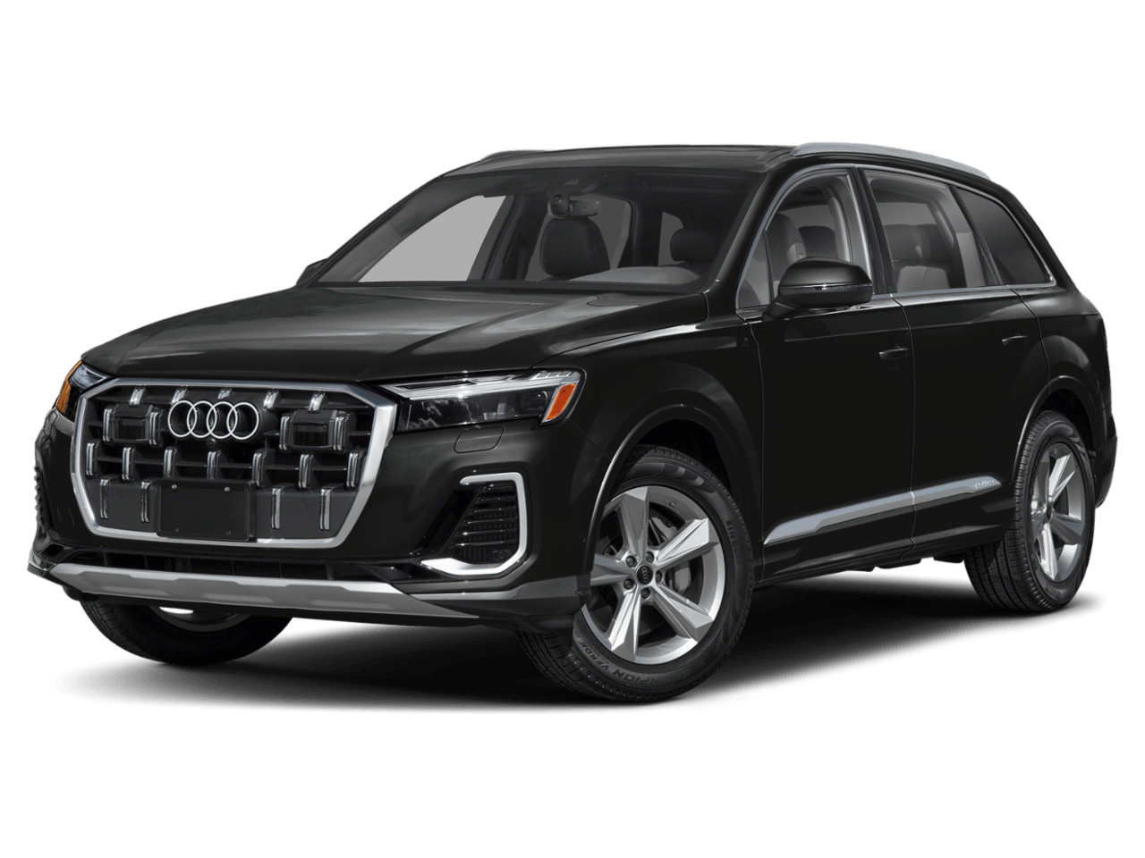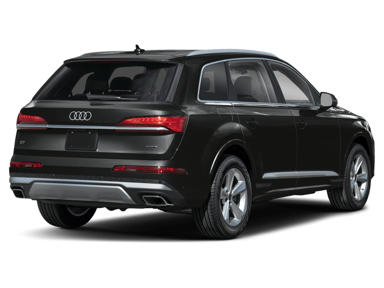 quattro 2026 Audi Q7 55 Premium Plus quattro quattro mythos black metallic 8-Speed Automatic with Tiptronic Black Optic Package (Anthracite Gray Audi Rings, Black Door Blades, Black Exterior Trim, Black Grille, Black Roof Rails, Black Wheel Center Caps, Black Window Surrounds, Dark Chrome Exhaust Tips, and Wheels: 21" 5-Double-Spoke-Module-Design with Matte Gray Finish), LED Interior Lighting Plus Package, Premium Plus Package (4-Way Power Lumbar For Passenger Seat, Adaptive Air Suspension, Bang & Olufsen Premium Sound System with 3D Sound, Control Buttons in Gloss Black with Haptic Feedback, Dual-Pane Acoustic Glass For Side Windows, Four-Zone Automatic Climate Control, Heated Rear Seats, Heated Steering Wheel, Illuminated Door Sills, Power Soft-Closing Doors, Rear Door/Side Windows and Tailgate Sunshades, Top View Camera System with Virtual 360 View, Ventilation For Front Seats, and Wheels: 20" 5-Double-Spoke), 10 Speakers, 3rd row seats: bench, 4-Wheel Disc Brakes, 7-Pin Adapter, 7700 lbs Towing Capacity, ABS brakes, Air Conditioning, Alloy wheels, AM/FM radio, Audi Beam Rings, Audi Guard All-Weather Mats, Audi Guard Wheel Lock Kit, Auto High-beam Headlights, Auto-dimming door mirrors, Auto-dimming Rear-View mirror, Automatic temperature control, Brake assist, Bumpers: body-color, Compass, Delay-off headlights, Driver door bin, Driver vanity mirror, Dual front impact airbags, Dual front side impact airbags, Electronic Stability Control, Emergency communication system: Audi connect CARE, Exterior Parking Camera Rear, Four wheel independent suspension, Front anti-roll bar, Front Bucket Seats, Front Center Armrest, Front dual zone A/C, Front fog lights, Front reading lights, Fully automatic headlights, Garage door transmitter: HomeLink, Genuine wood door panel insert, Heated door mirrors, Heated Front Bucket Seats, Heated front seats, Illuminated entry, Leather Seating Surfaces, Leather Shift Knob, Leather steering wheel, Low tire pressure warning, Memory seat, Navigation system: Audi MMI Navigation plus with Touch Response, Occupant sensing airbag, Outside temperature display, Overhead airbag, Overhead console, Panic alarm, Passenger door bin, Passenger vanity mirror, Power door mirrors, Power driver seat, Power Liftgate, Power moonroof: Panoramic, Power passenger seat, Power steering, Power windows, Privacy Trunk Cover, Radio data system, Radio: Audi Sound System, Rain sensing wipers, Rear air conditioning, Rear anti-roll bar, Rear fog lights, Rear reading lights, Rear seat center armrest, Rear side impact airbag, Rear window defroster, Rear window wiper, Reclining 3rd row seat, Remote keyless entry, Security system, Speed control, Speed-sensing steering, Split folding rear seat, Spoiler, Steering wheel memory, Steering wheel mounted audio controls, Tachometer, Telescoping steering wheel, Tilt steering wheel, Traction control, Trailer Hitch, Trip computer, Turn signal indicator mirrors, Variably intermittent wipers, and Wheels: 19" 5-Arm-Star Design.