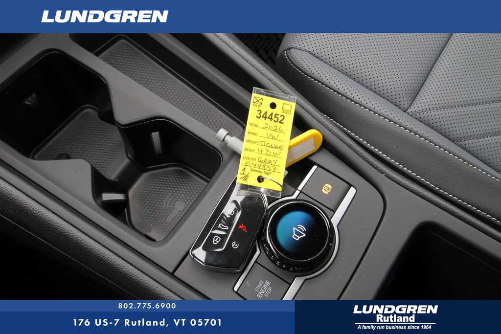 AWD 2026 Volkswagen Tiguan 2.0T SE Recent Arrival! platinum gray metallic 8-Speed Automatic AWD, 4-Wheel Disc Brakes, 4-Wheel Independent Suspension, 7 Speakers, ABS brakes, Air Conditioning, Alloy wheels, AM/FM radio: SiriusXM with 360L, Auto High-beam Headlights, Auto-dimming Rear-View mirror, Automatic temperature control, Brake assist, Bumpers: body-color, Compass, Delay-off headlights, Driver door bin, Driver vanity mirror, Dual front impact airbags, Dual front side impact airbags, Electronic Stability Control, Emergency communication system, Exterior Parking Camera Rear, First Aid Kit, Four wheel independent suspension, Front anti-roll bar, Front Bucket Seats, Front Center Armrest, Front dual zone A/C, Front reading lights, Fully automatic headlights, Heated door mirrors, Heated Front Seats, Heated front seats, Heavy Duty Trunk Liner with VW CarGo Blocks, Illuminated entry, Knee airbag, Leather Shift Knob, Low tire pressure warning, Occupant sensing airbag, Outside temperature display, Overhead airbag, Overhead console, Panic alarm, Passenger door bin, Passenger vanity mirror, Perforated V-Tex Leatherette Seating Surfaces, Power door mirrors, Power driver seat, Power Liftgate, Power steering, Power windows, Radio data system, Radio: MIB4 Composition Media Touchscreen with AM/FM, Rain sensing wipers, Rear anti-roll bar, Rear reading lights, Rear seat center armrest, Rear side impact airbag, Rear window defroster, Rear window wiper, Remote keyless entry, Roadside Assistance Kit, Rubber Monster Mats Kit (set of 4), Security system, Speed control, Speed-sensing steering, Split folding rear seat, Spoiler, Steering wheel mounted audio controls, Tachometer, Telescoping steering wheel, Tilt steering wheel, Traction control, Trip computer, Turn signal indicator mirrors, Variably intermittent wipers, VW Care, and Wheels: 19" 2-Tone Machined Alloy.